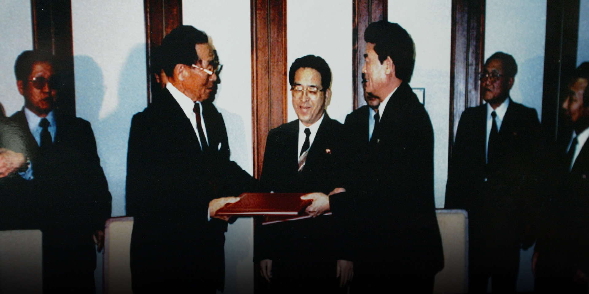 1989.1.23 남측 기업인 최초로 북측 공식 방문 정주영 명예회장은 분단 이후 남측 기업인으로서 북측을 공식 방문했다. 정 명예회장은 북측과 『금강산 및 시베리아 공동개발에 관한 의정서』를 체결했다. 의정서 5조에는 "동부지구 군사분계선을 통과해 금강산을 왕래하도록 한다" 라고 합의했고, 이는 훗날 금강산 육로관광의 단초가 되었다.