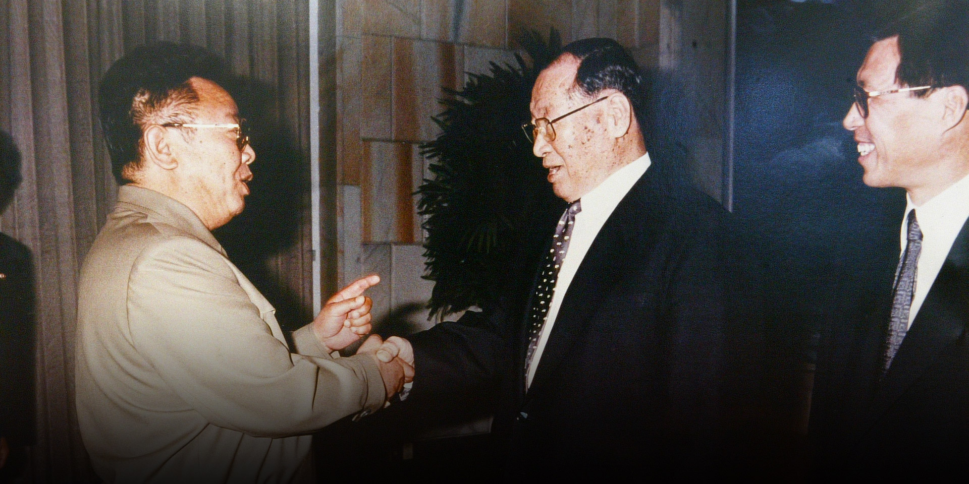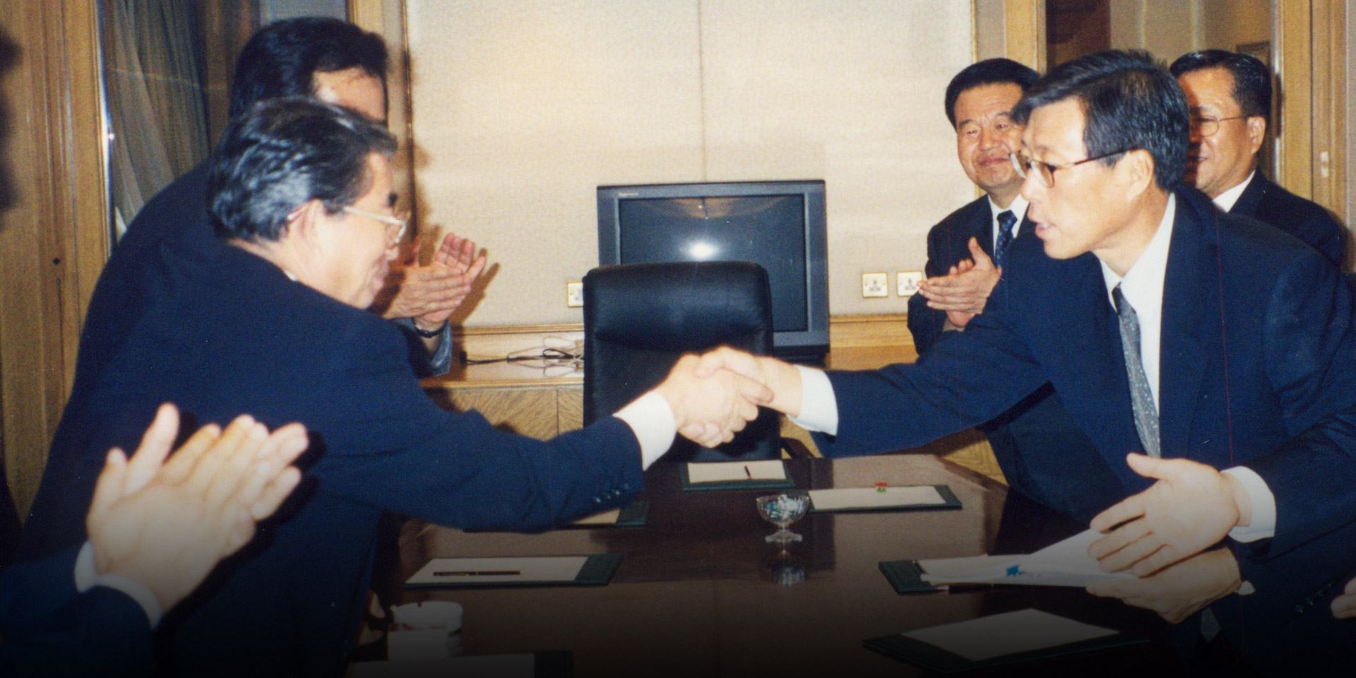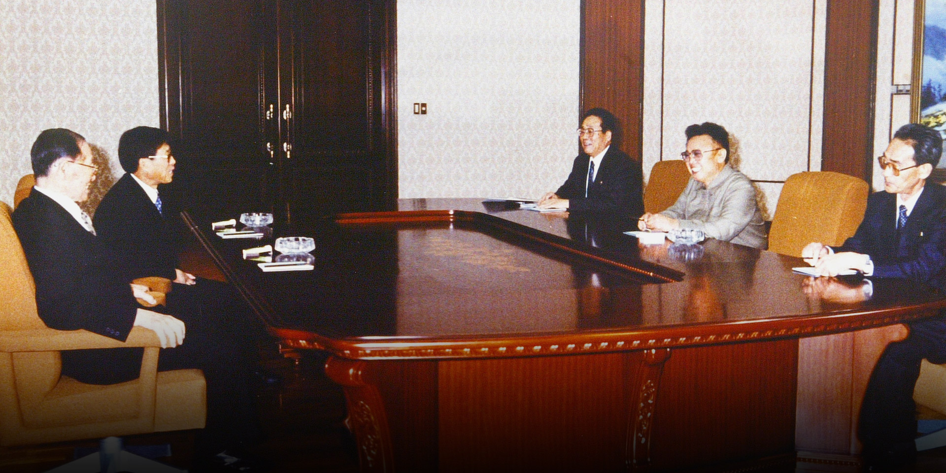 1998.10.30 정주영 명예회장-김정일 국방위원장 1차 면담 정주영 명예회장은 1998년 10월 27일 501마리 소떼를 이끌고, 2차 소떼방북을 진행했다. 방북 길에 나선 정주영 명예회장과 정몽헌 회장은 북측 백화원초대소에서 김정일 국방위원장과 첫 면담을 진행했다. 이 면담을 통해 현대가 추진 중인 남북경협사업은 급물살을 타게 되었다.